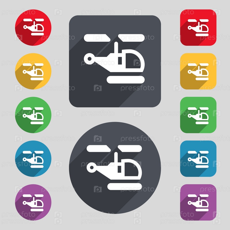 Вертолет значок знак. Набор 12 цветных кнопок и длинную тень. Плоский дизайн. Вектор