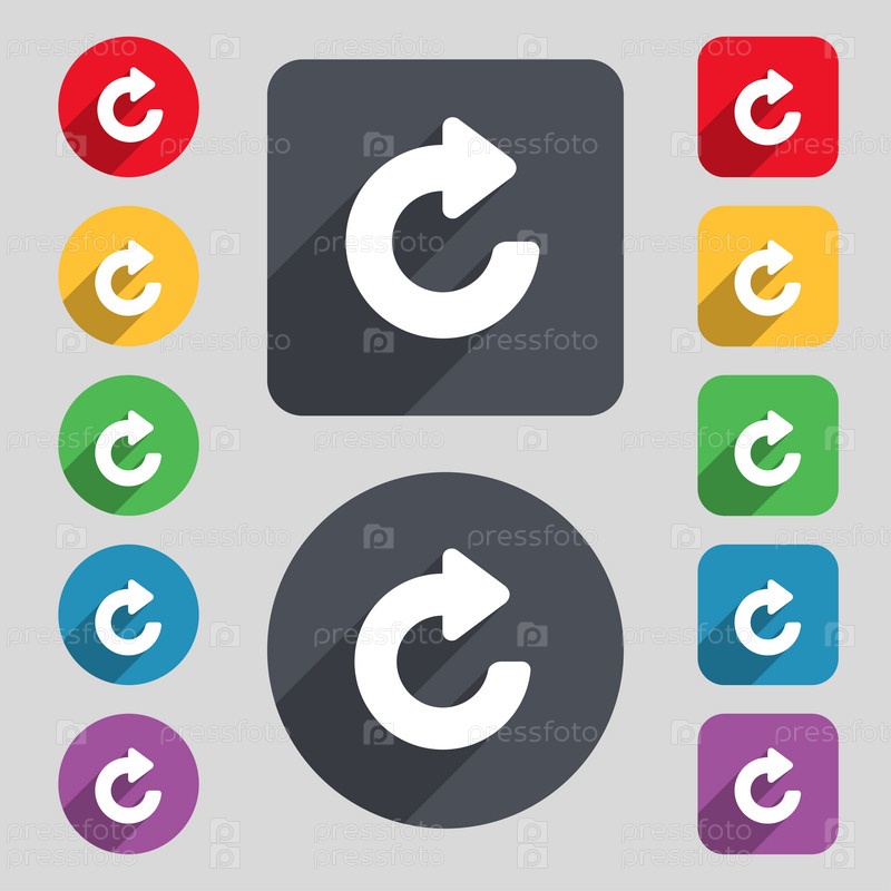 Обновление, знак значок стрелки. Набор 12 цветных кнопок и длинную тень. Плоский дизайн. Вектор
