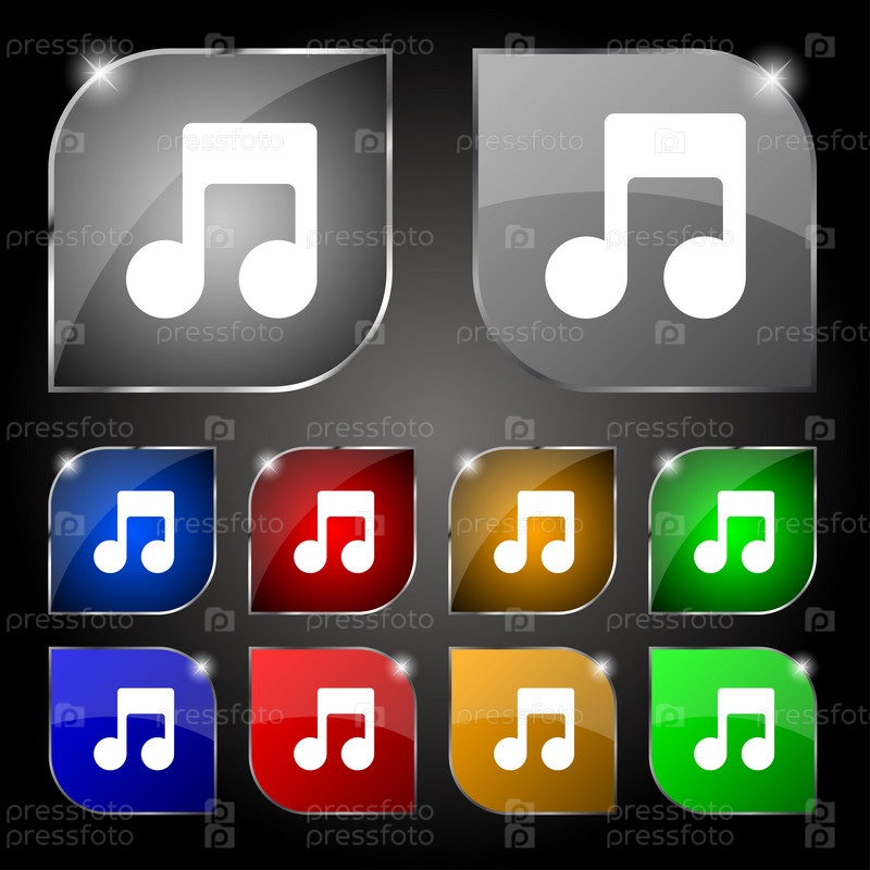 Музыка Примечание значок знак. Набор из десяти красочных кнопок с антибликовым покрытием. Вектор