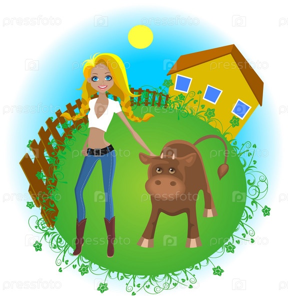 Деревенский домик, девушка и бык