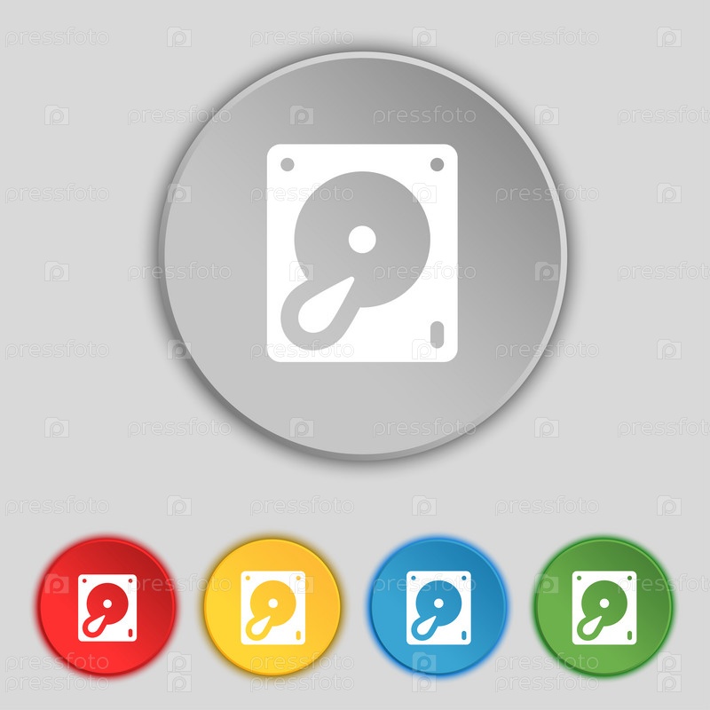 Жесткий диск и знак базы данных. Символ на пяти плоских кнопок. Вектор