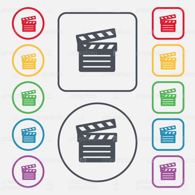 Кино Клаппер значок знак. символ на круглых и квадратных кнопок с рамкой. Вектор