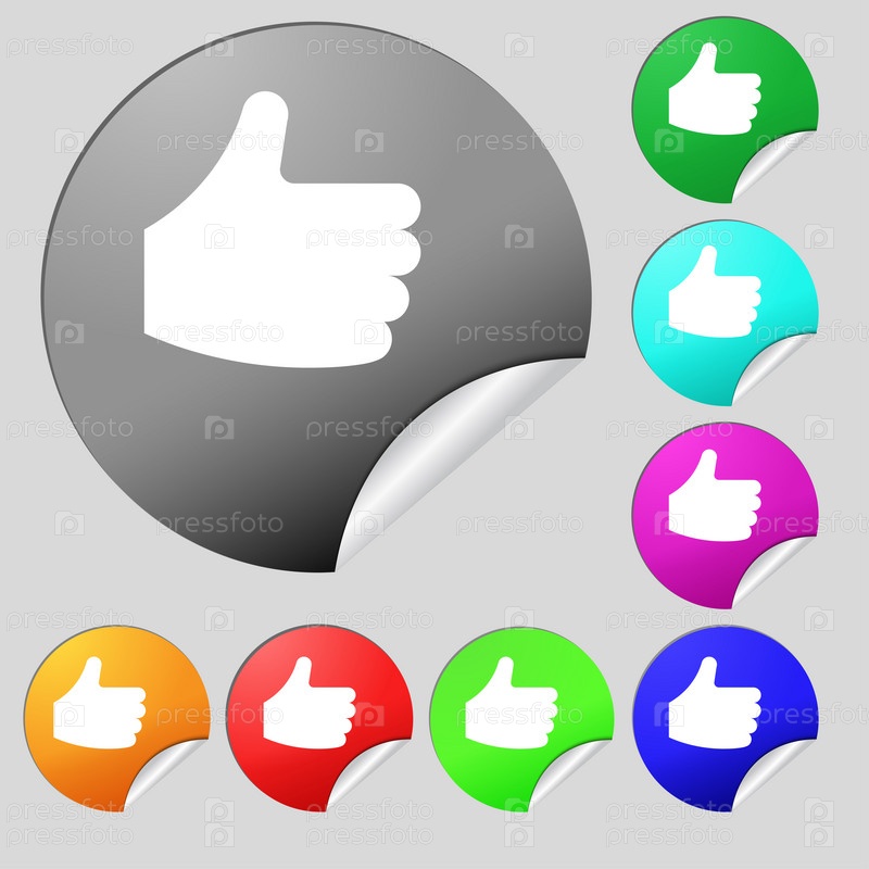 Большой палец вверх значок знак. Набор из восьми разноцветных круглых кнопок, наклейки. Вектор
