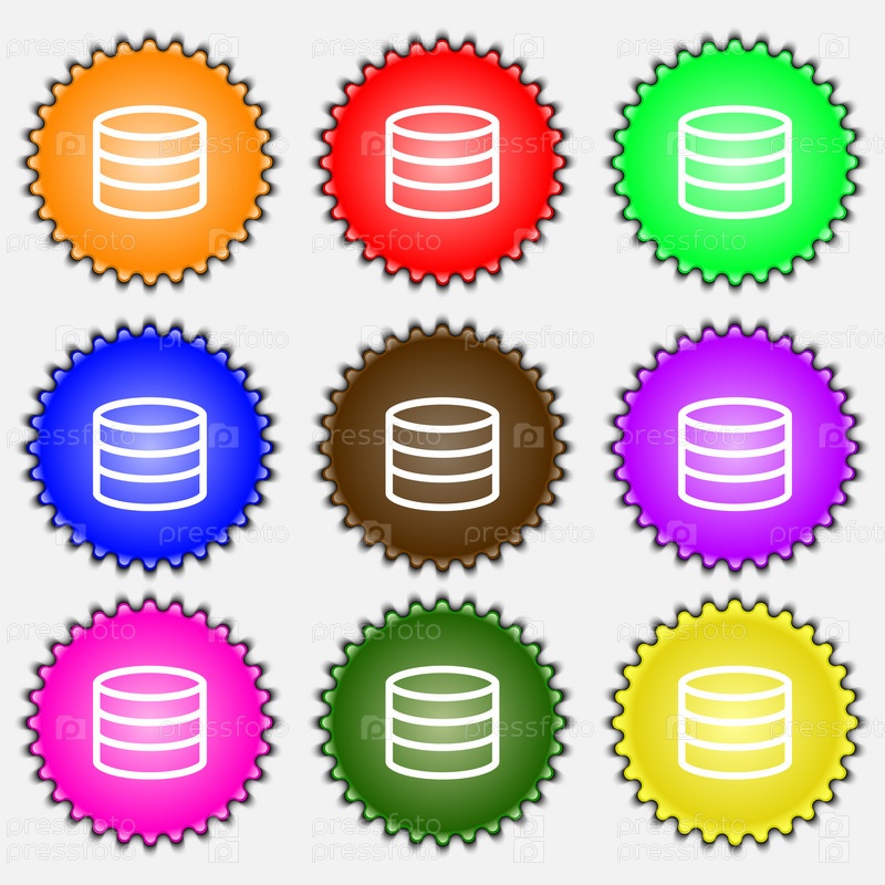 Жесткий диск и знак значок базы данных. Набор из девяти различных цветных этикеток. Вектор