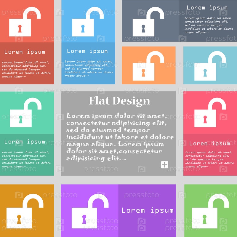 Открытый замок значок знак. Набор разноцветных кнопок с пространства для текста. Вектор