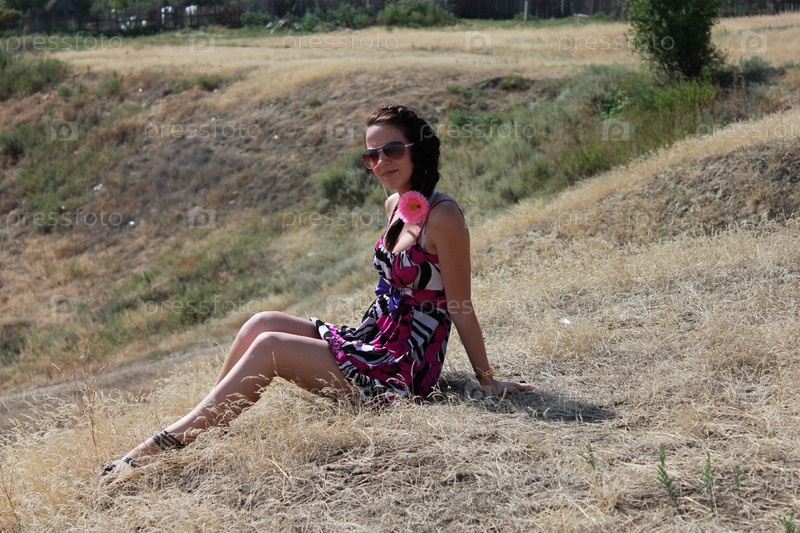 Девушка в платье сидит на траве