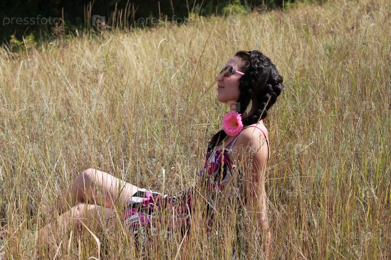 Девушка в платье сидит на траве