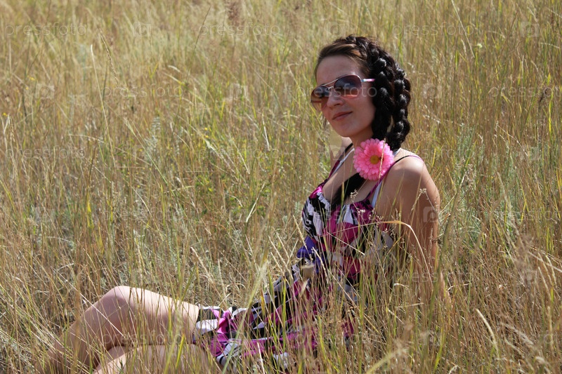 Девушка в платье сидит на траве