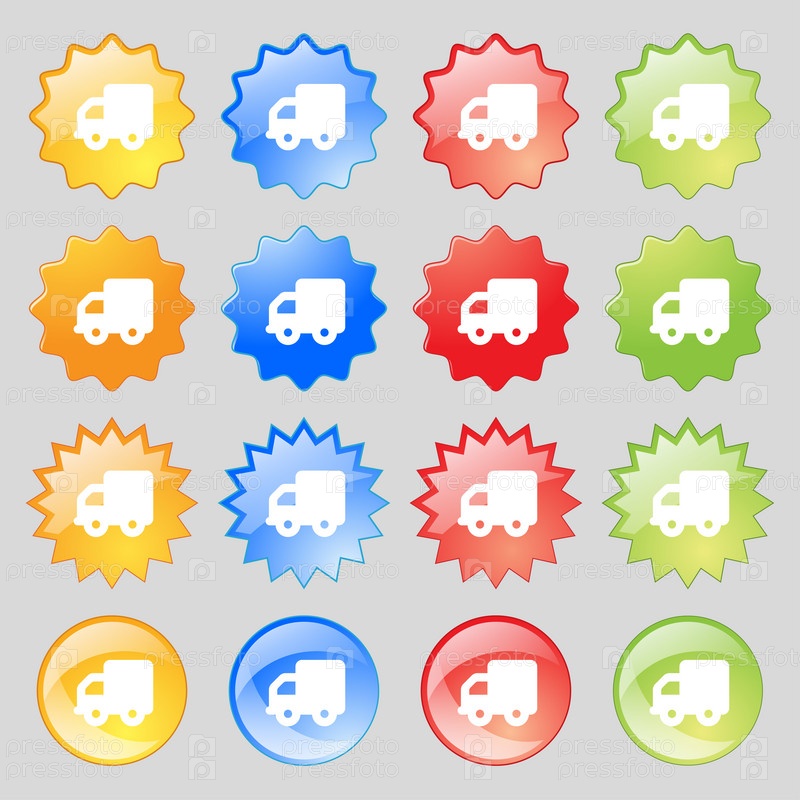Грузовик доставки значок знак. Набор из 16 кнопок разноцветного стекла с местом для текста. Вектор