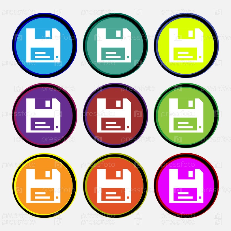 Флоппи значок знак. Девять разноцветных круглых кнопок. Вектор