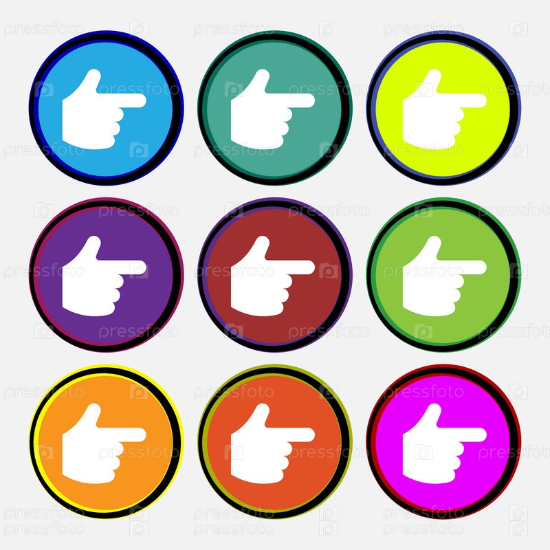 Указывает знак значок руки. Девять разноцветных круглых кнопок. Вектор