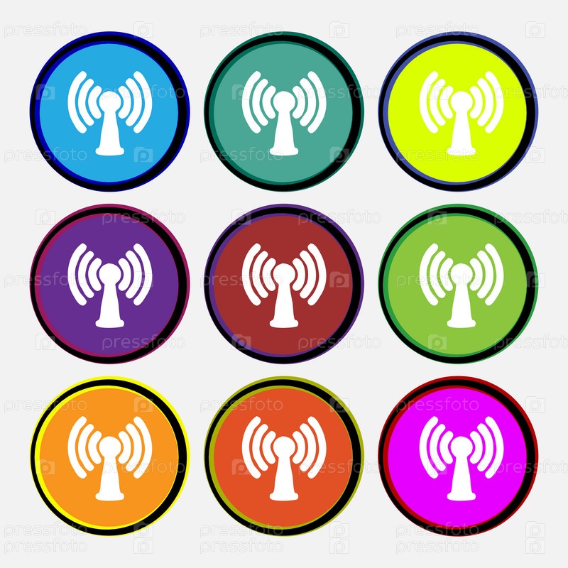 Wi-fi, интернет иконка значок. девять многоцветных круглых кнопок. вектор
