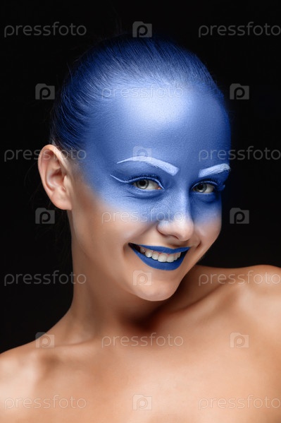 Портрет женщины, которая позирует и покрыта синей краской