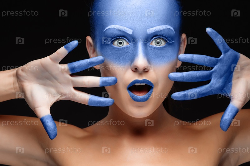 Портрет женщины, которая позирует и покрыта синей краской