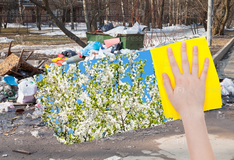 Рука удаляет городской мусор, желтая ткань