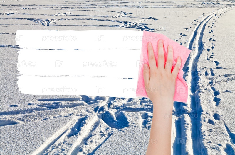 Рука удаляет поле снег зимой розовые тряпкой