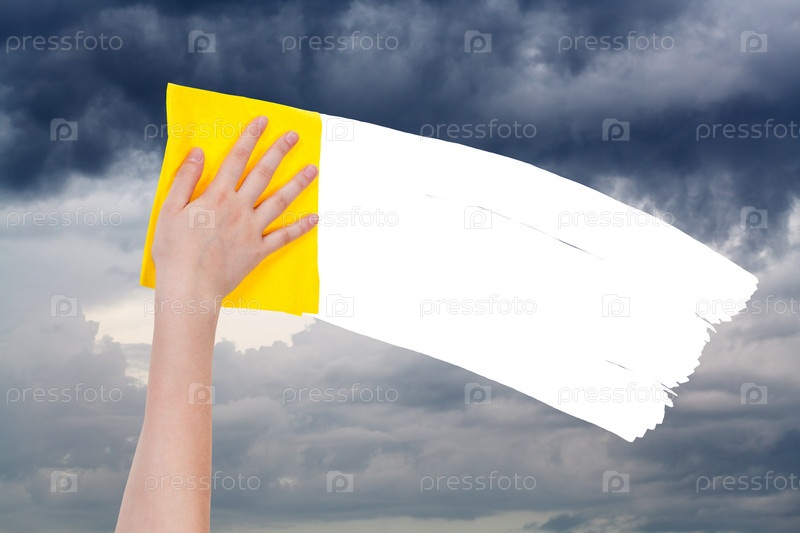Рука удаляет пасмурное небо желтые тряпкой