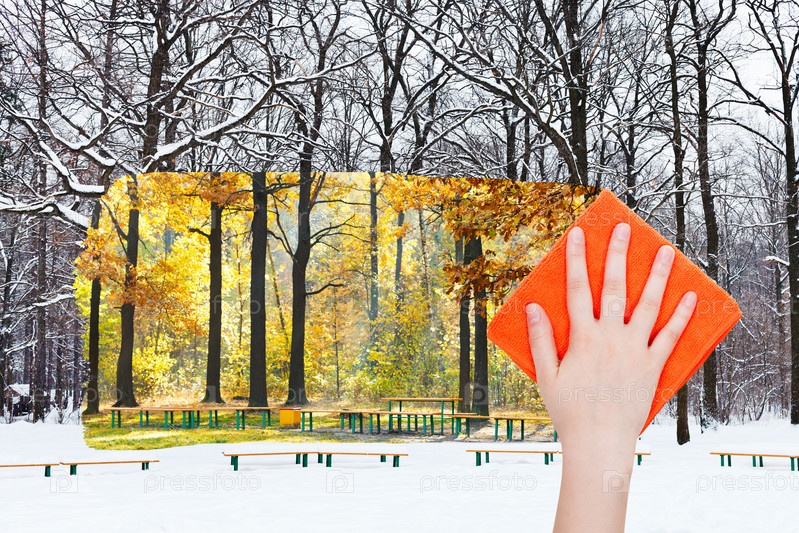 Рука удаляет зимний городской парк
