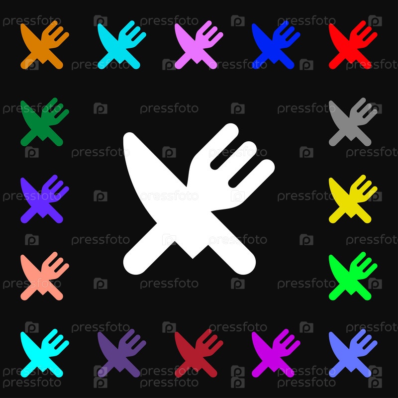 Ешьте, столовые приборы значок знак. Много красочных символов для вашего дизайна. Вектор