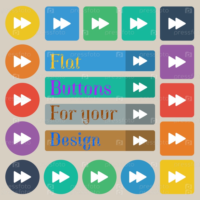 Перемотка значок знак. Набор двадцати цветные плоские, круглые, квадратные и прямоугольные кнопки. Вектор