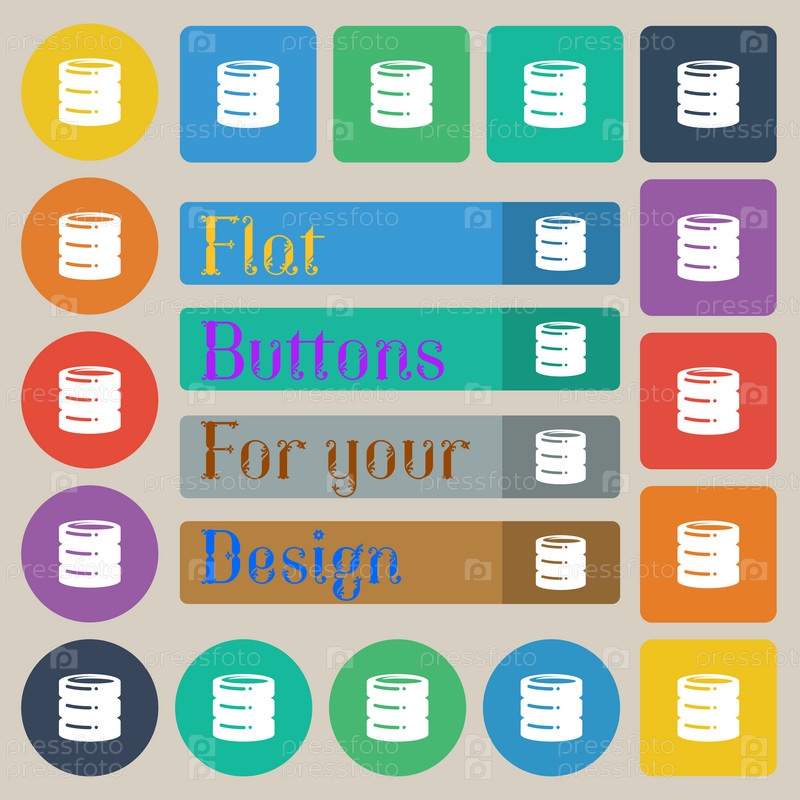 Жесткий диск, Дата базовая значок знак. Набор двадцати цветные плоские, круглые, квадратные и прямоугольные кнопки. Вектор