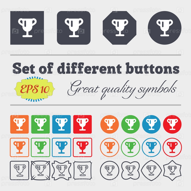 Победитель Кубка, награждение победителей, трофей значок знак. Большой набор красочных, разнообразных, высококачественных кнопок. Вектор