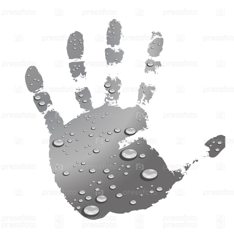 Отпечаток ладони и капли воды на нем. Изолированный на белом фоне