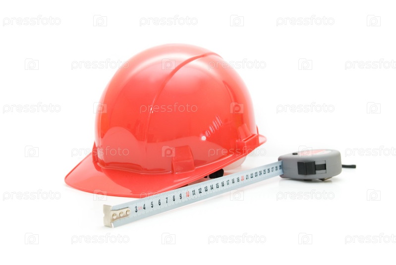 Красная защитная каска и измерительная лента на белом фоне