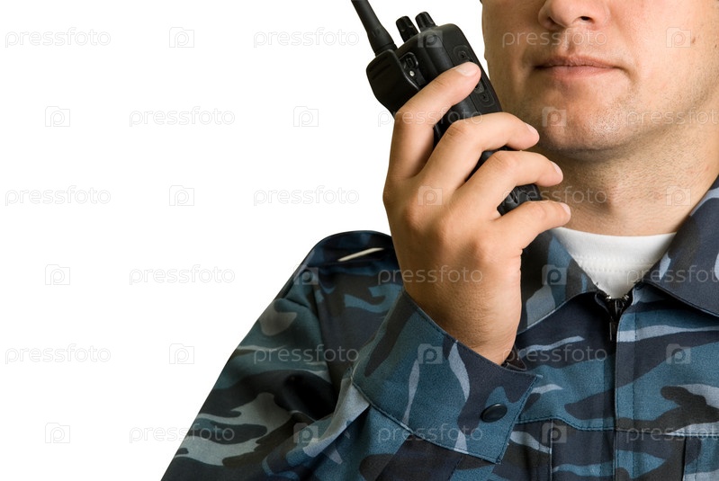Охранник с рацией в руке