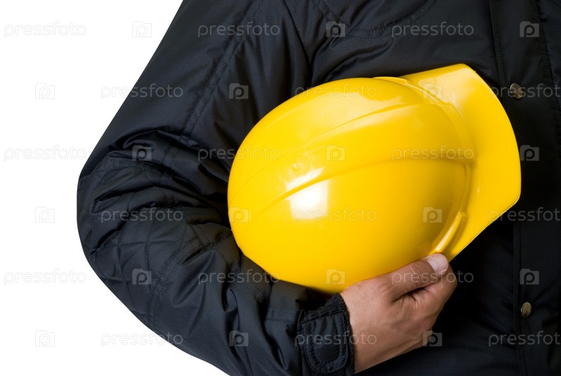 Желтая каска в руке человека на белом фоне