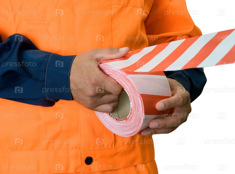 Мужчина разматывает предупреждающую ленту