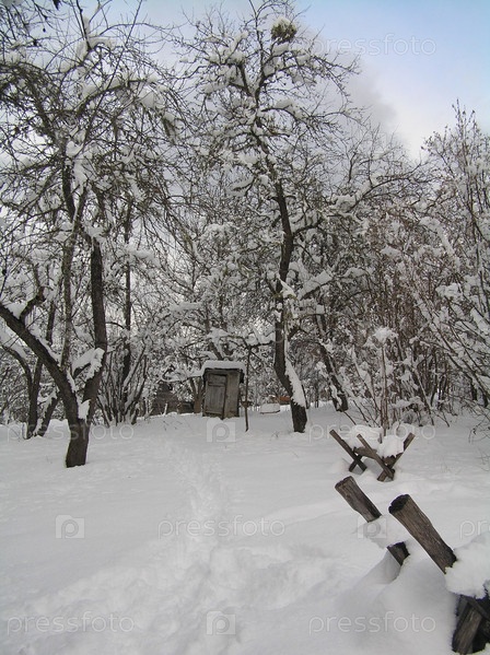 Покосившийся деревенский забор и сарай в глубоком снегу
