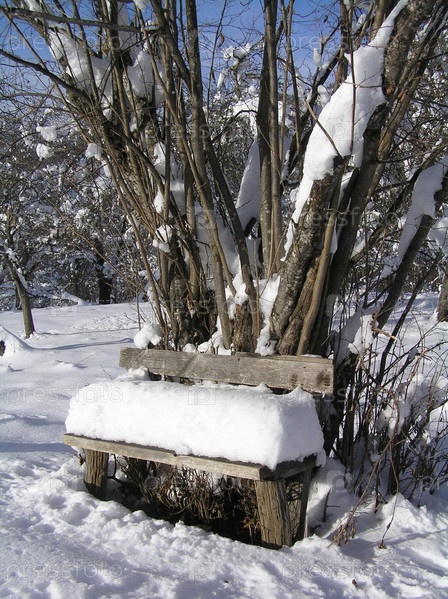 Деревянная скамейка под деревом в глубоком снегу