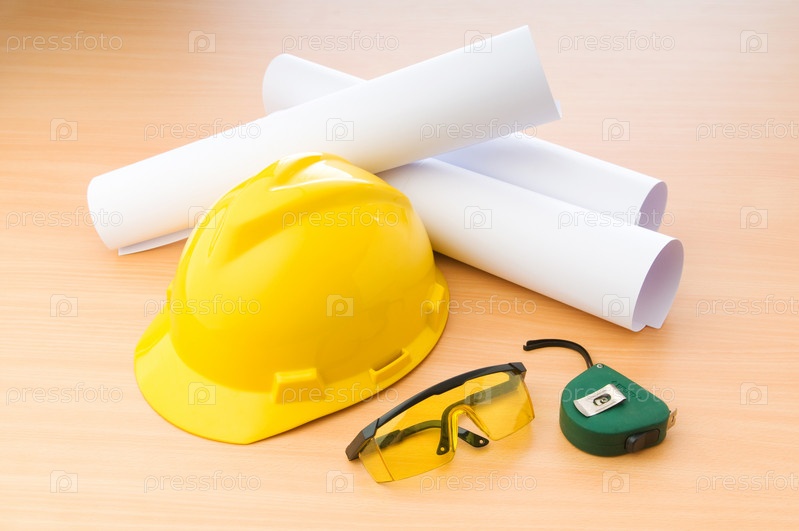 Чертежи, рулетка, очки и каска на столе