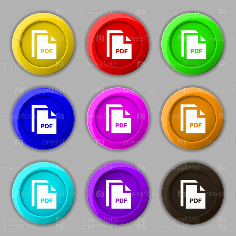 Файл PDF значок символа. символ на 9 круглых красочных кнопок. вектор