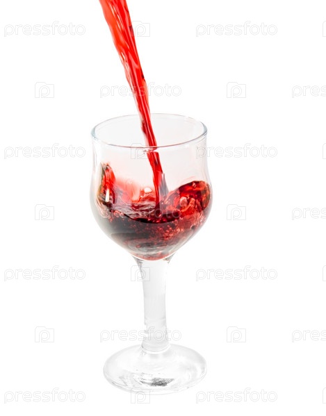 Красное вино льется в бокал, белый фон