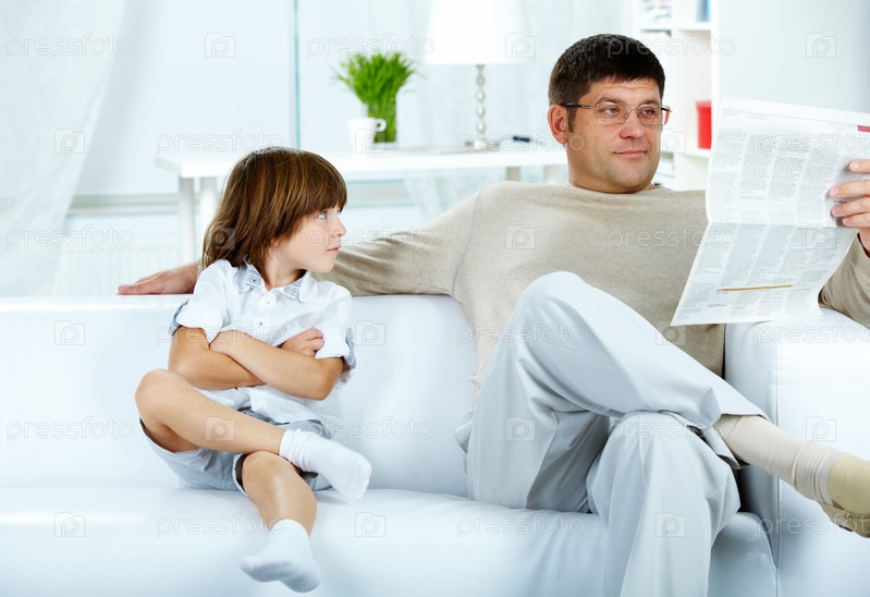Отец читает газету, сидя с сыном на диване