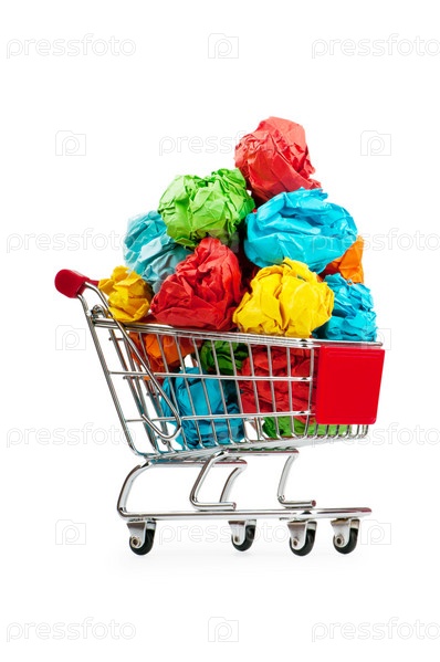 Продуктовая тележка с мятой бумагой. Концепция переработки бумаги