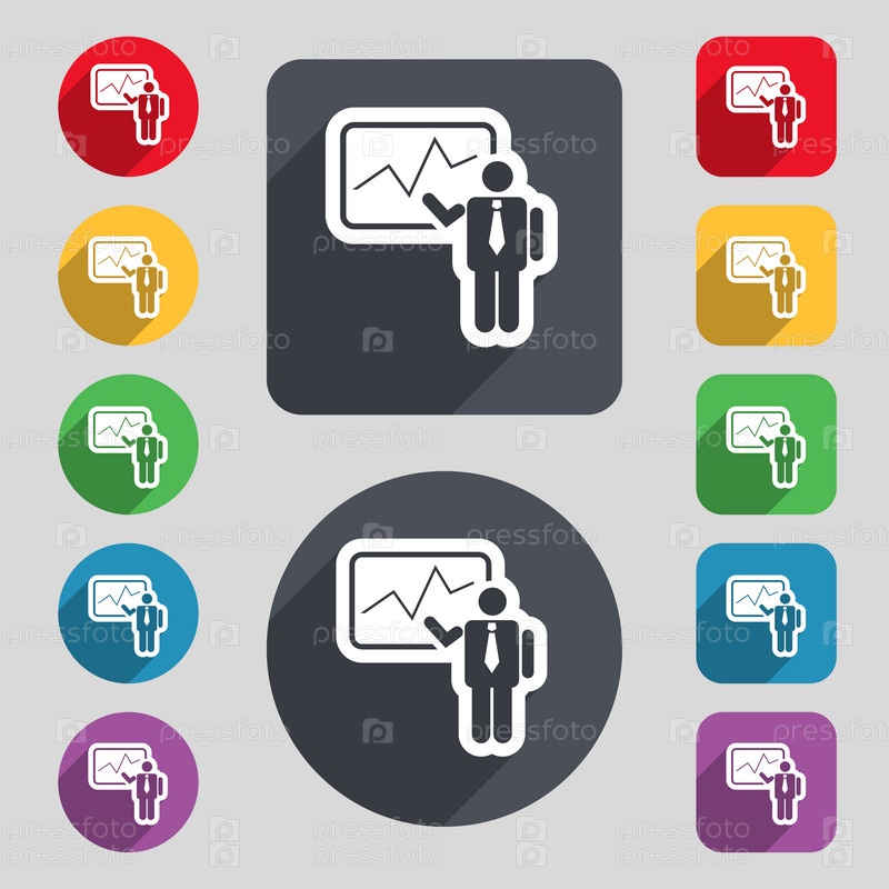 Бизнесмен, делая доклад значок знак. Набор 12 цветных кнопок и длинную тень. Плоский дизайн. Вектор