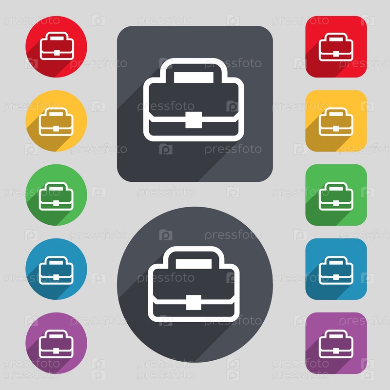 Портфель значок знак. Набор 12 цветных кнопок и длинную тень. Плоский дизайн. Вектор