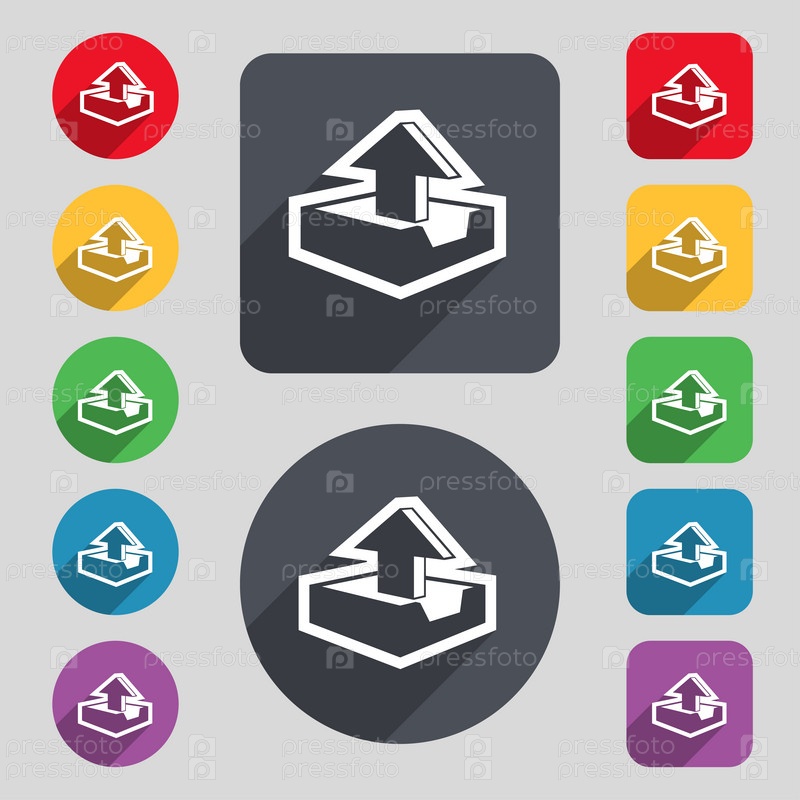 Загрузите значок знак. Набор 12 цветных кнопок и длинную тень. Плоский дизайн. Вектор