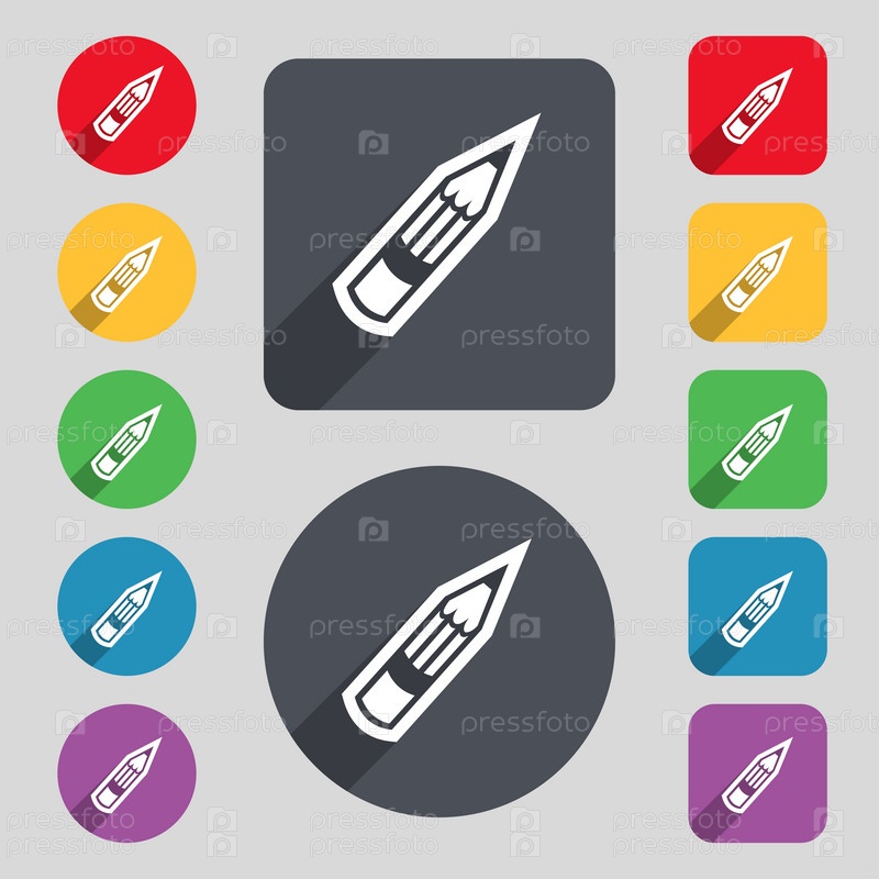 Знак значок карандаша. Набор 12 цветных кнопок и длинную тень. Плоский дизайн. Вектор