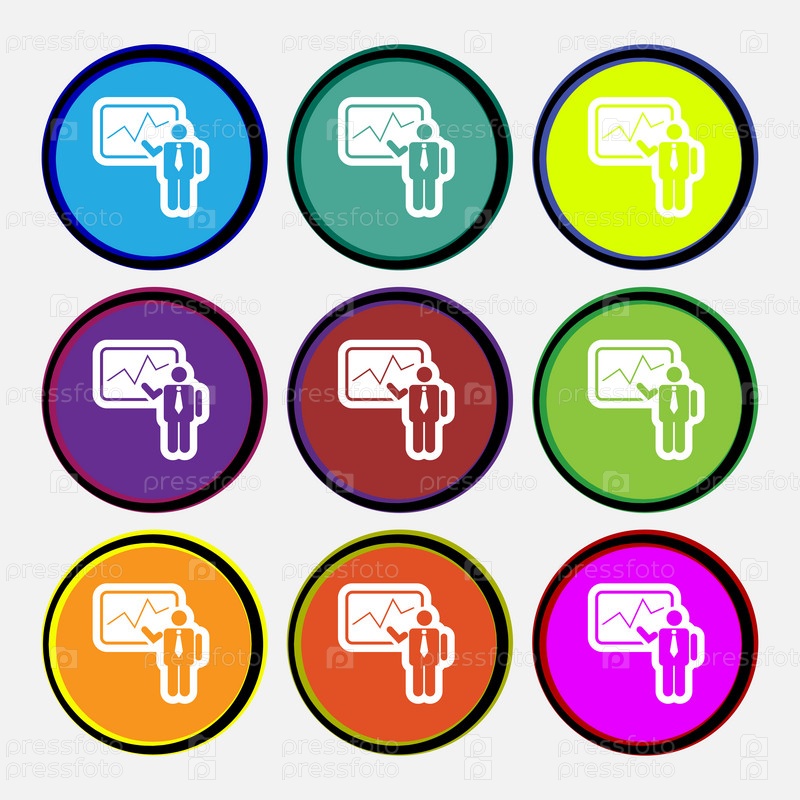 Бизнесмен, делающий доклад значок значка. девять многоцветных круглых кнопок. вектор