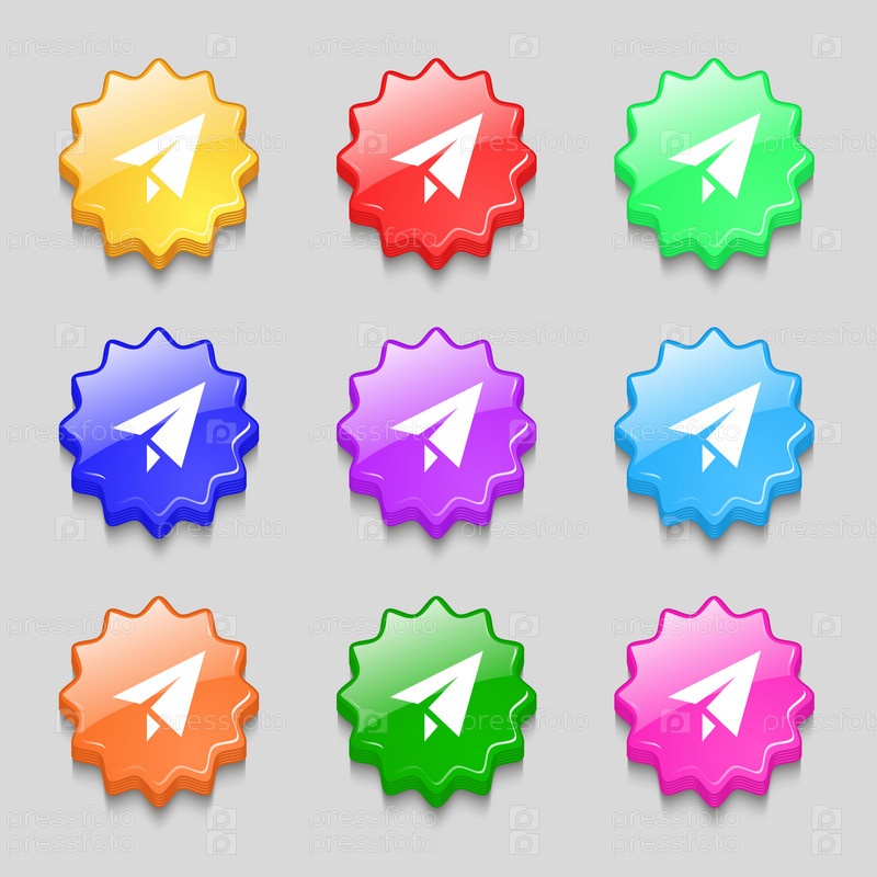 Бумага самолет значок знак. символ на девяти волнистые яркие кнопки. Вектор