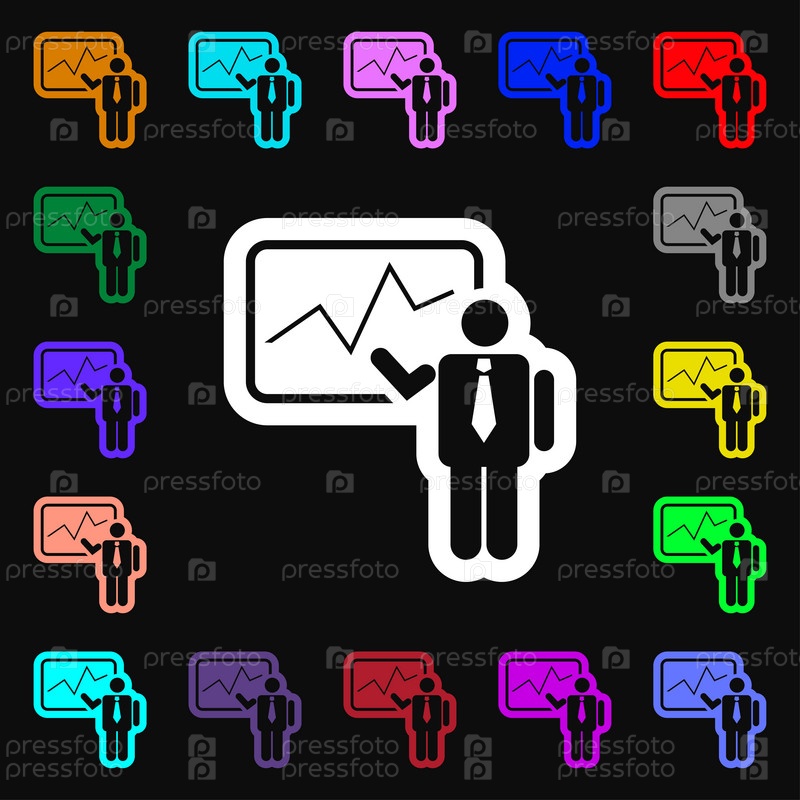 Бизнесмен, делая доклад значок знак. Много красочных символов для вашего дизайна. Вектор