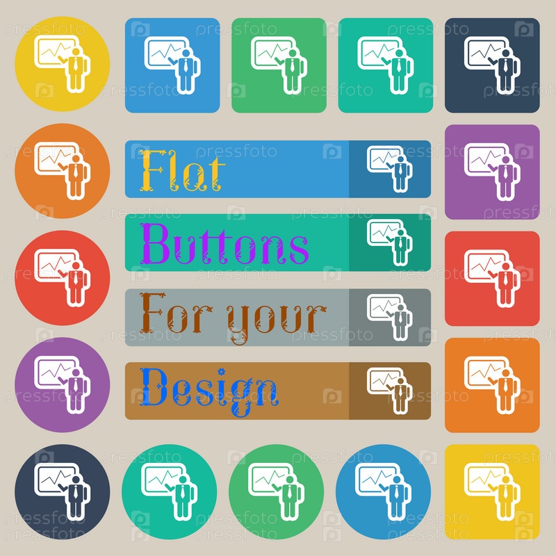 Бизнесмен, делая доклад значок знак. Набор двадцати цветные плоские, круглые, квадратные и прямоугольные кнопки. Вектор