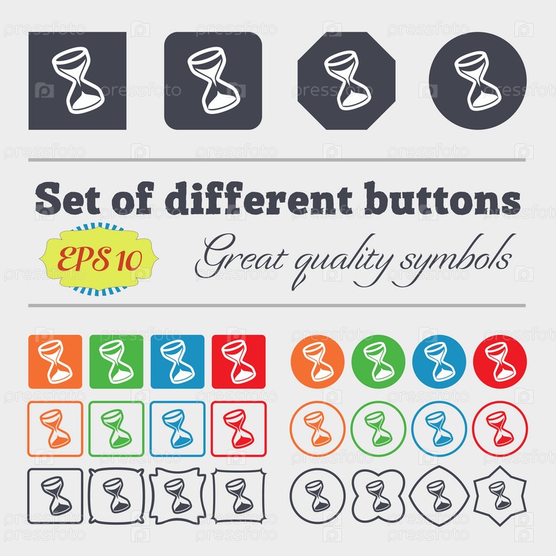 Песочные часы значок знак. Большой набор красочных, разнообразных, высококачественных кнопок. Вектор