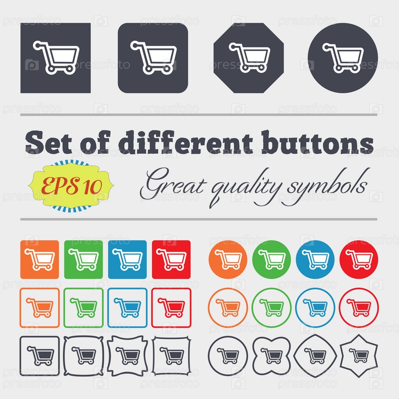 Торговый знак значок Корзина. Большой набор красочных, разнообразных, высококачественных кнопок. Вектор