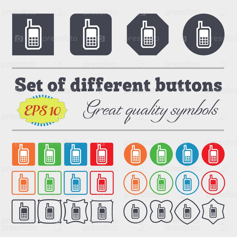 Мобильный телефон значок знак. Большой набор красочных, разнообразных, высококачественных кнопок. Вектор
