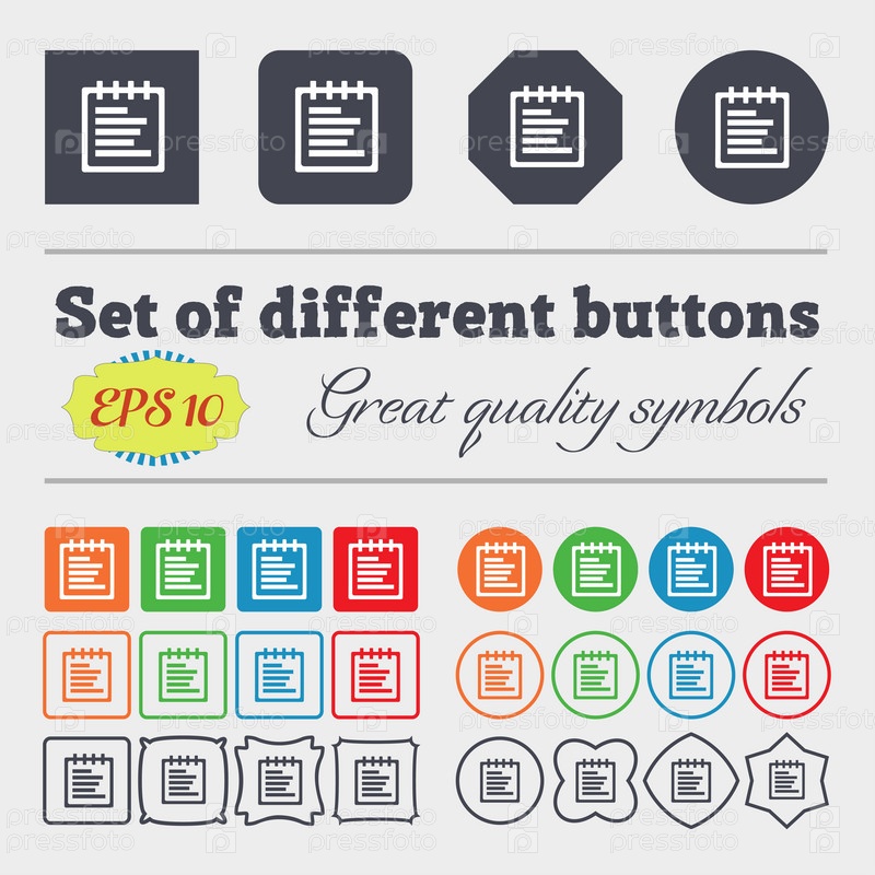 Блокнот значок знак. Большой набор красочных, разнообразных, высококачественных кнопок. Вектор